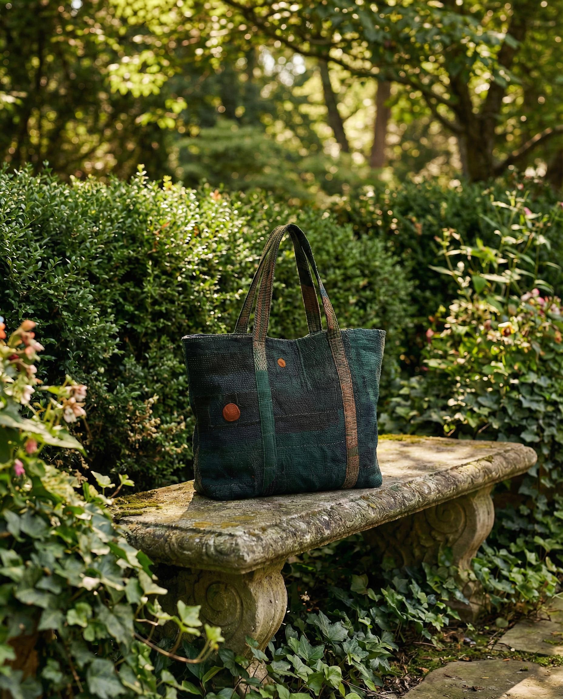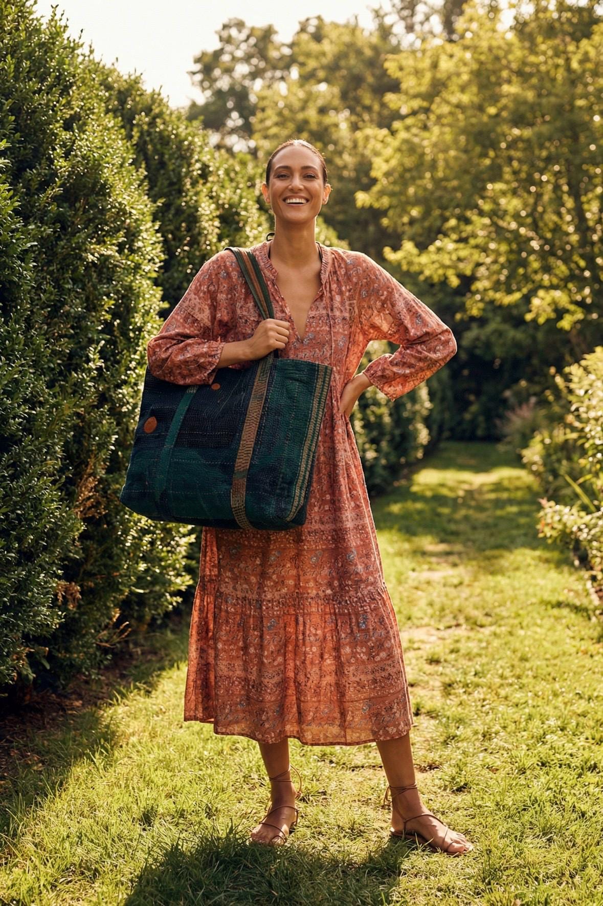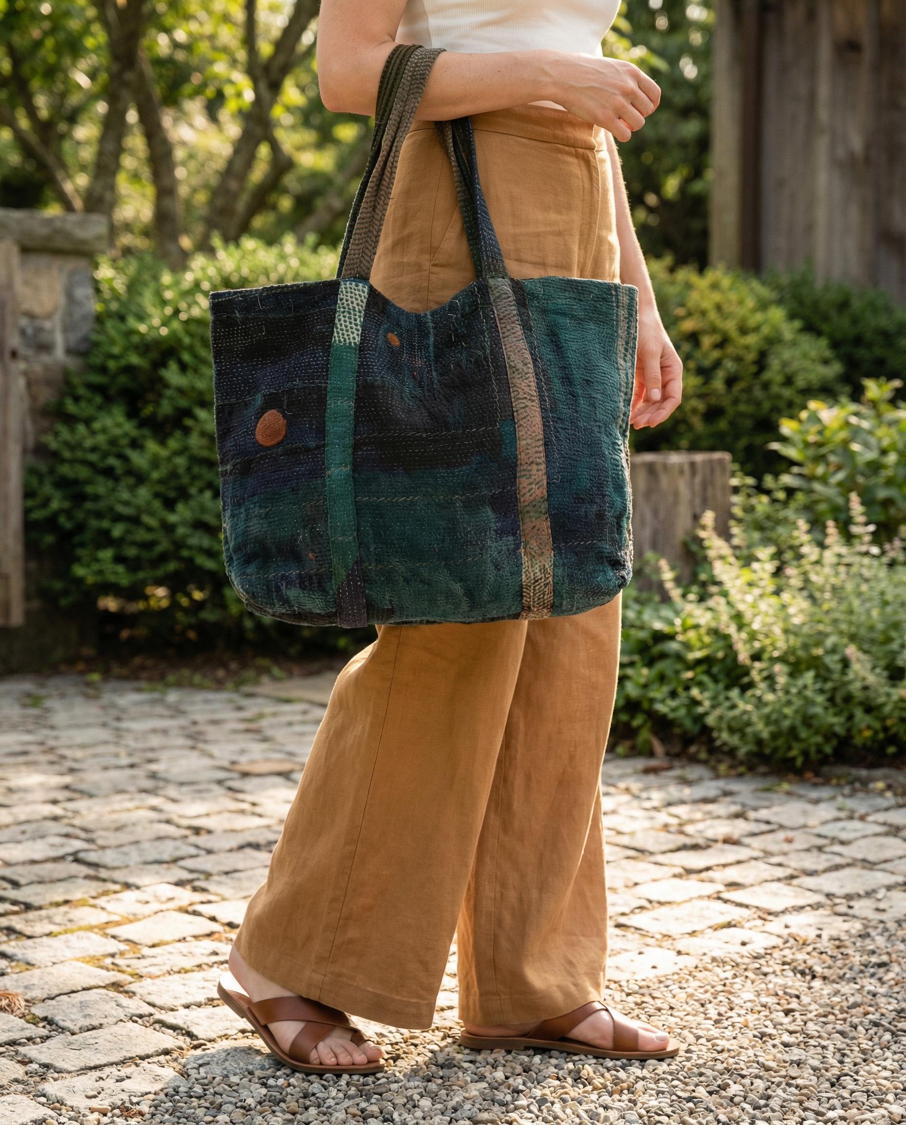 It’s the ultimate crossover bag. The dense, hand-stitched Kantha running stitch gives the bag incredible texture and durability, while the lightweight cotton makes it easy to carry all day. Toss in your laptop, a water bottle, your latest read, and a makeup bag for city days, or fill it with a towel and sunscreen for a spontaneous beach trip.