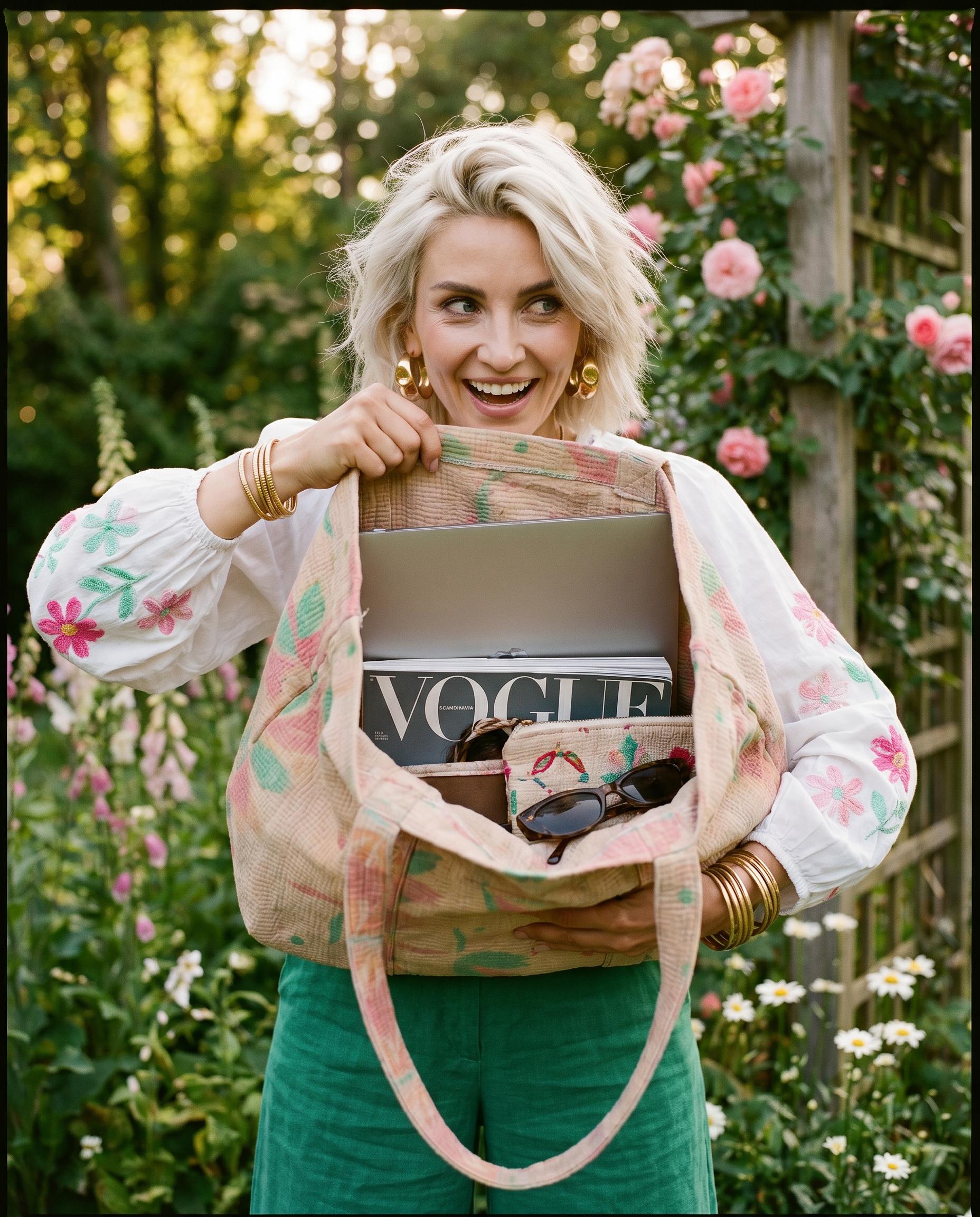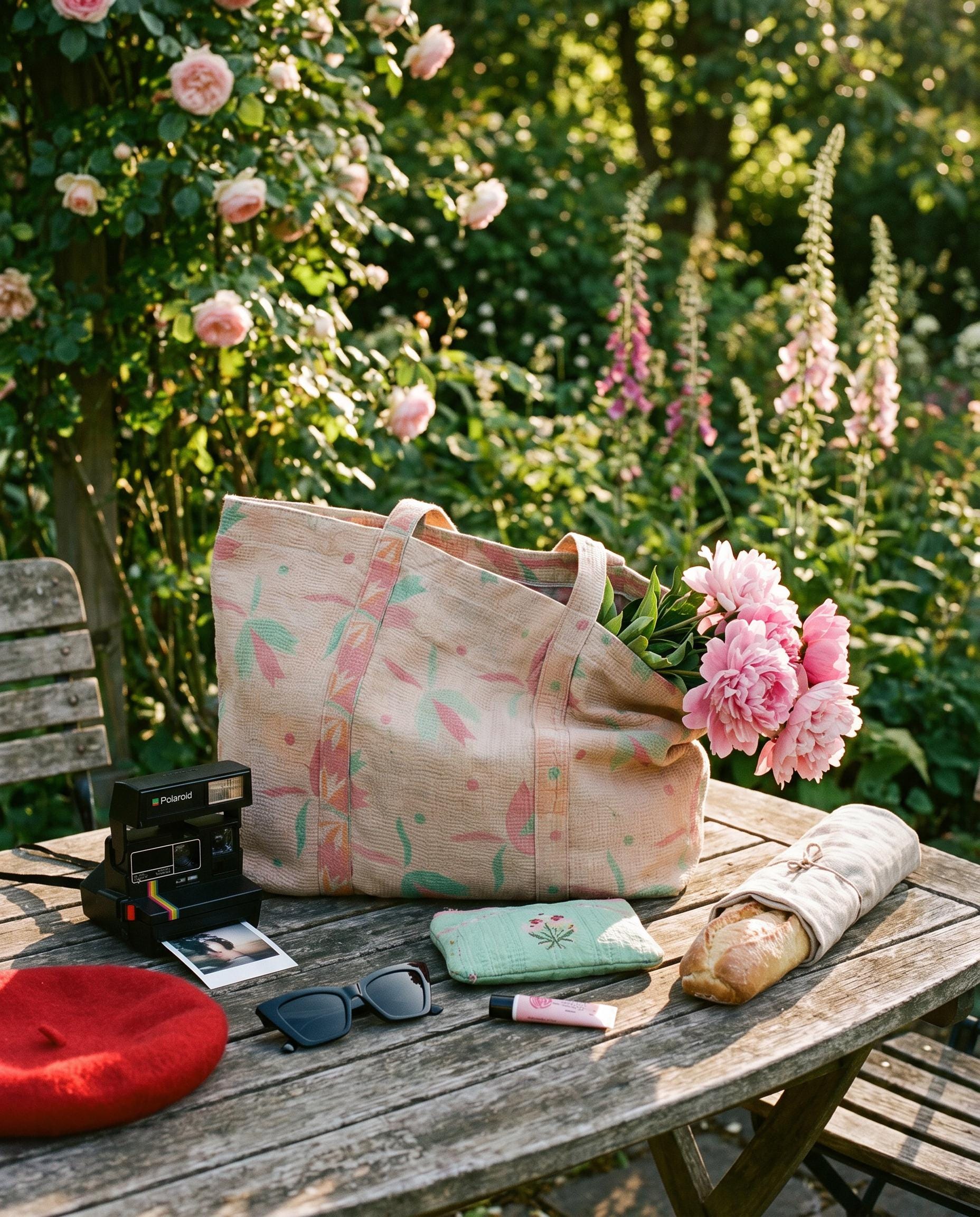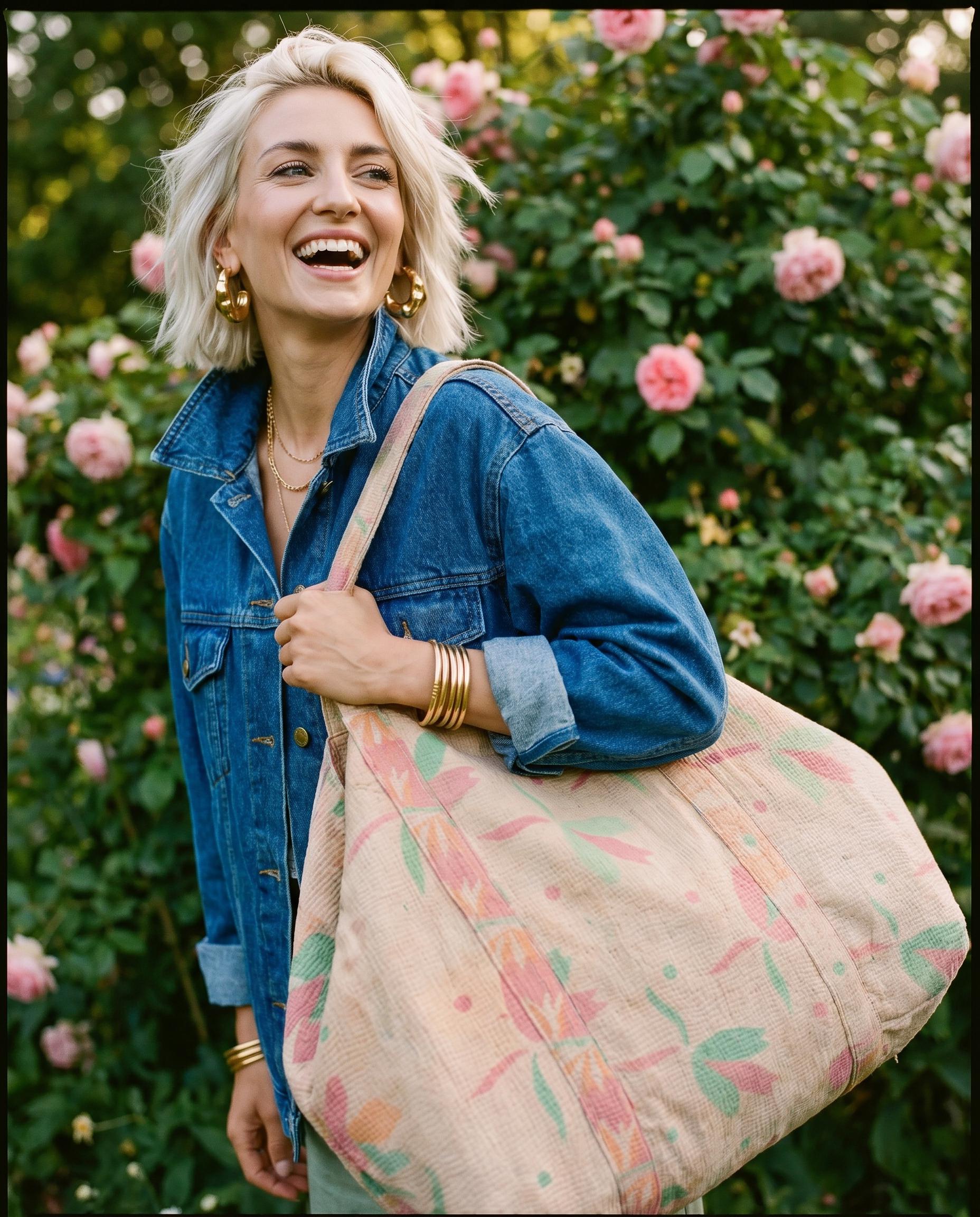A one-of-a-kind quilted tote bag handcrafted in Jaipur using traditional Kantha stitching.