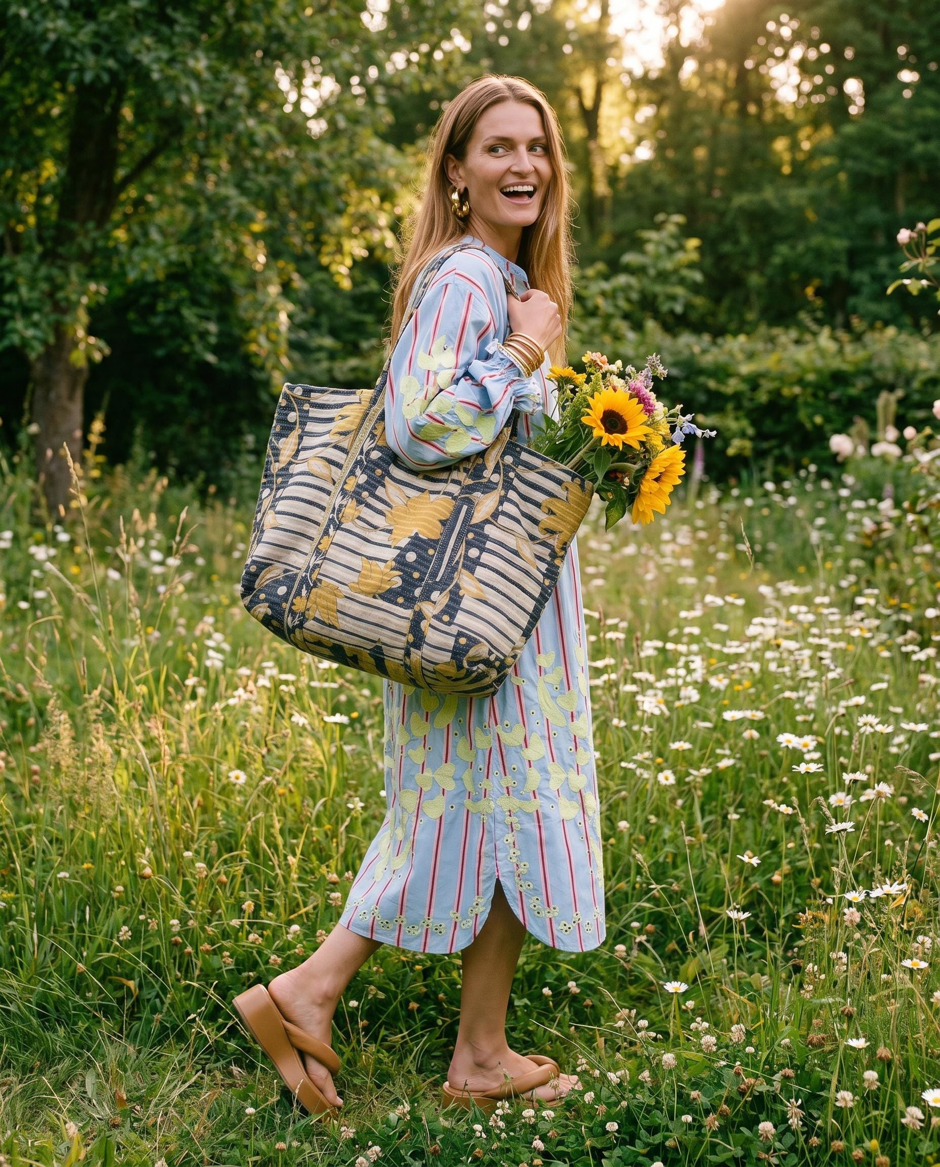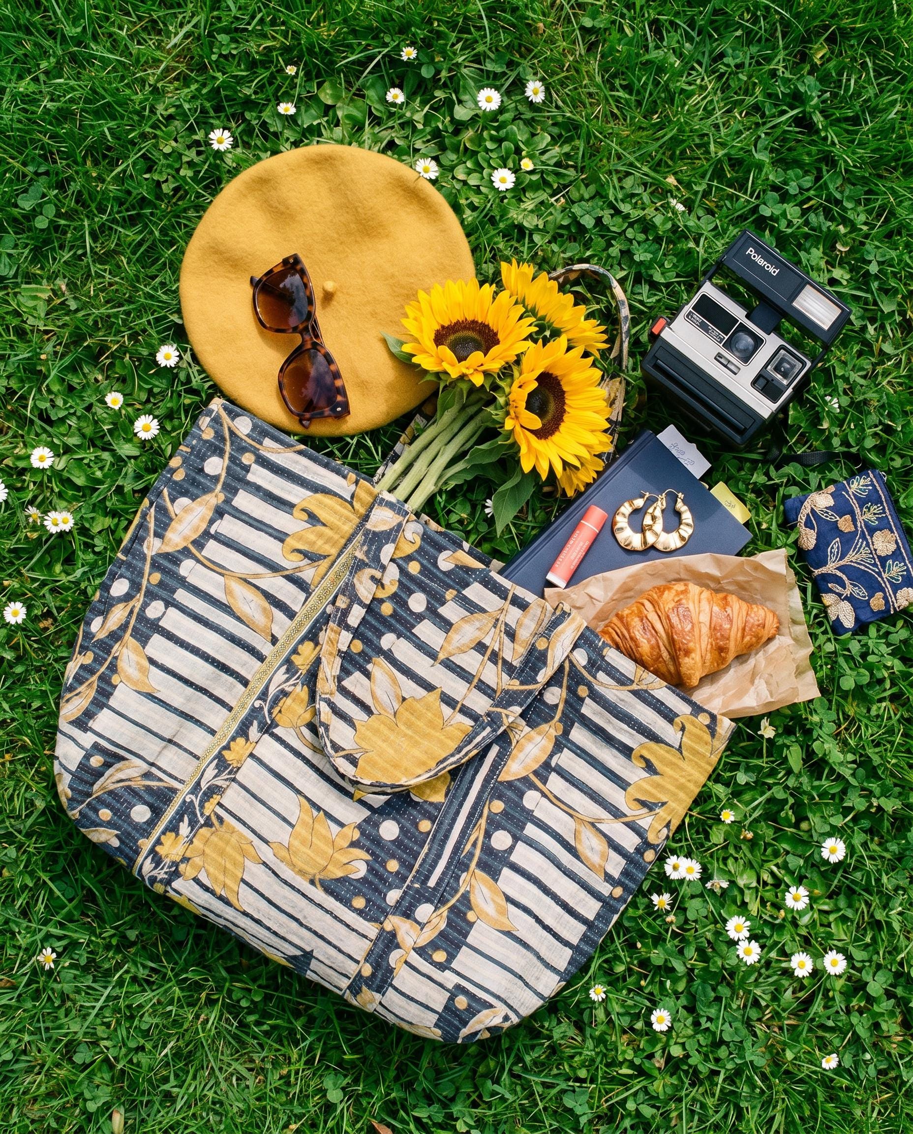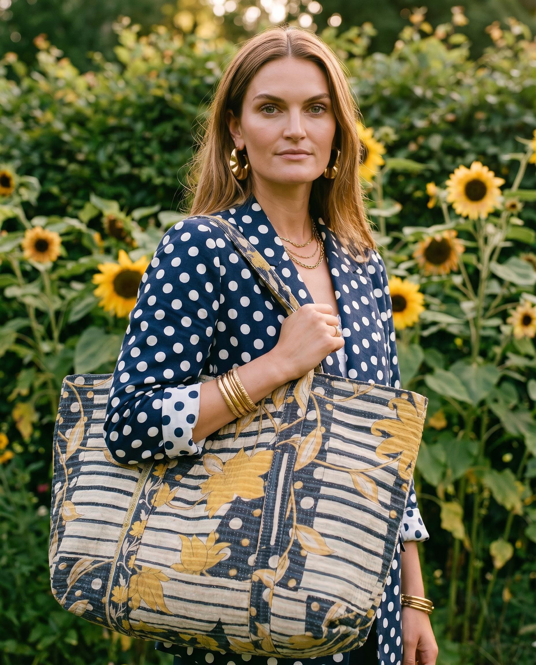 A one-of-a-kind quilted tote bag handcrafted in Jaipur using traditional Kantha stitching.