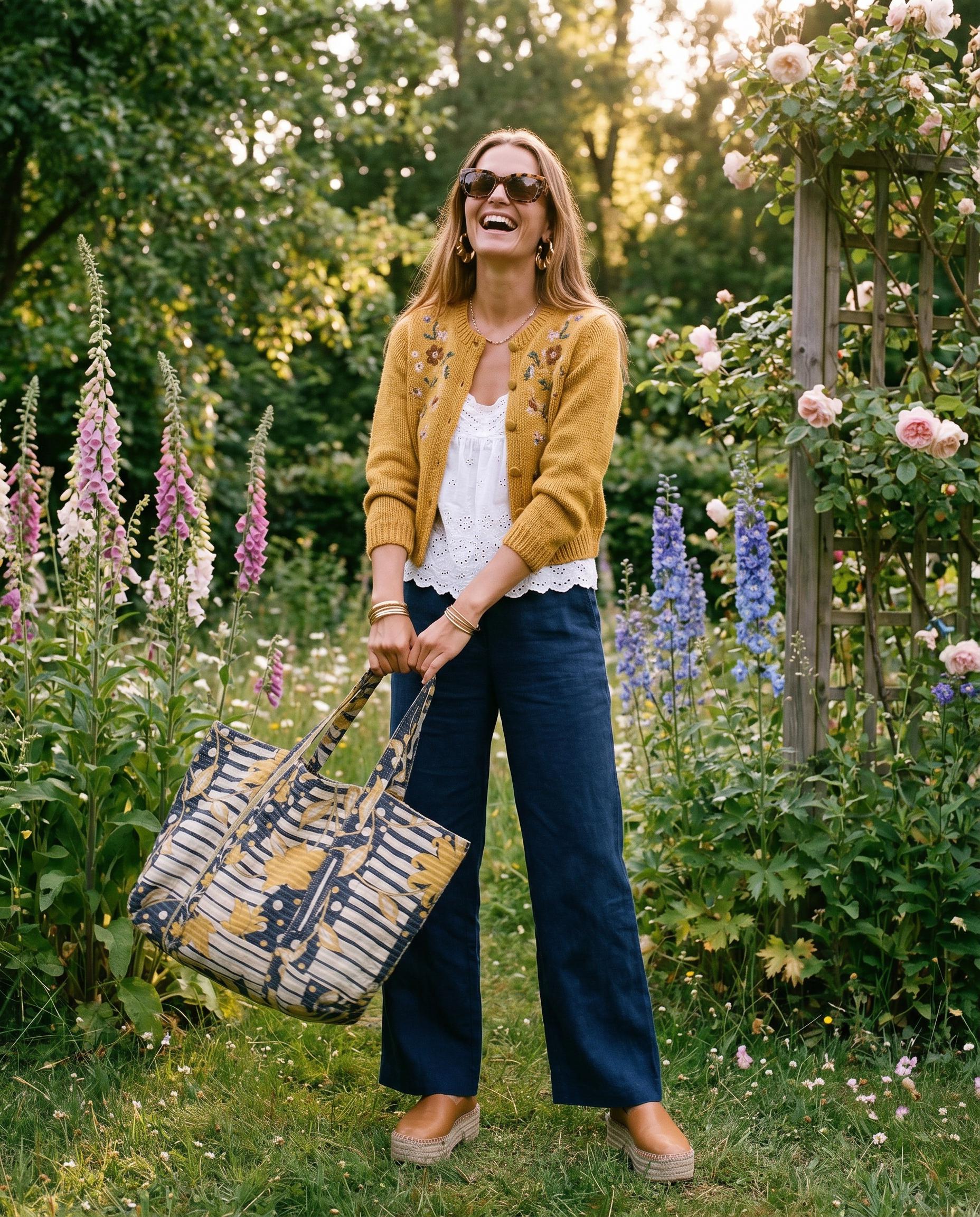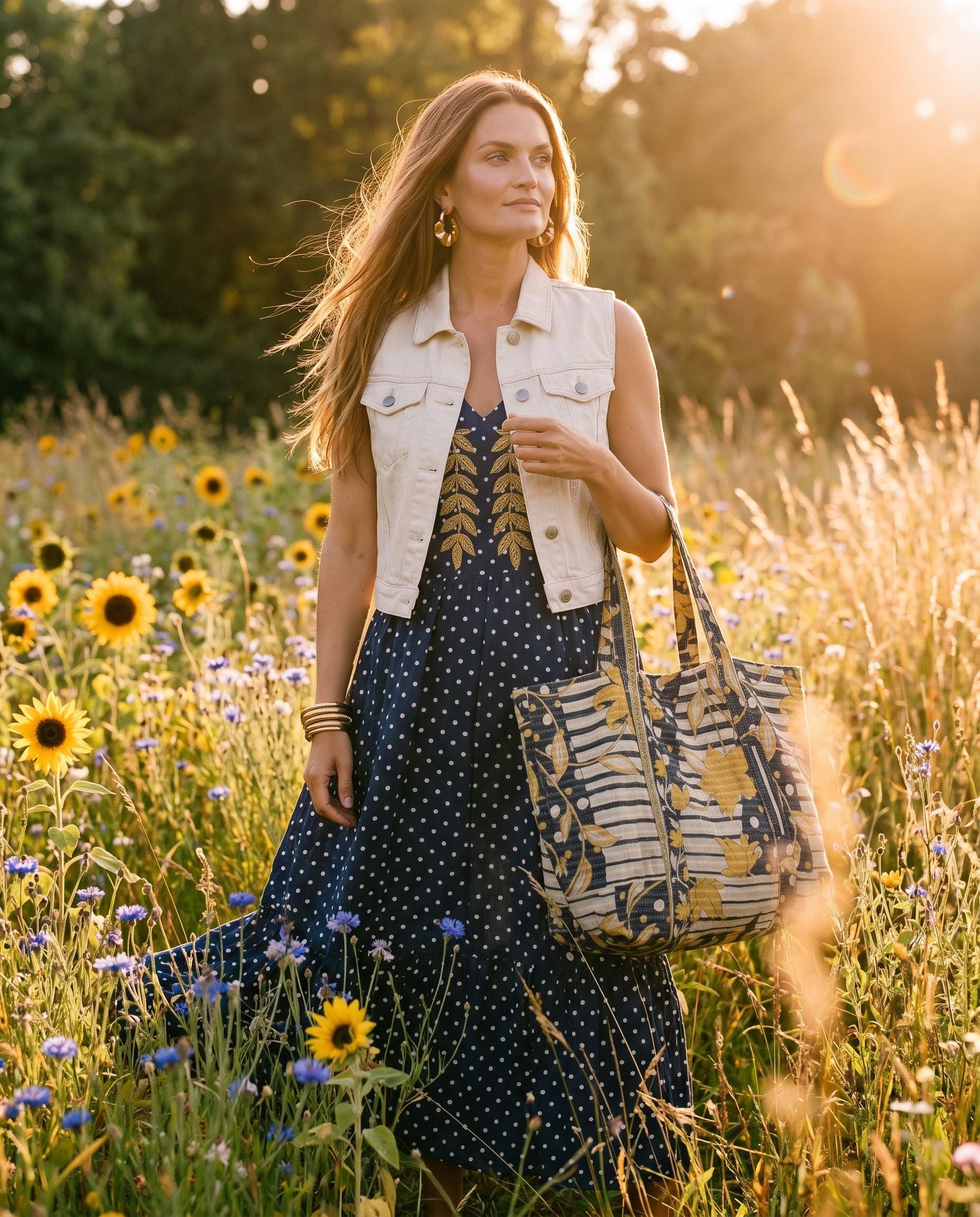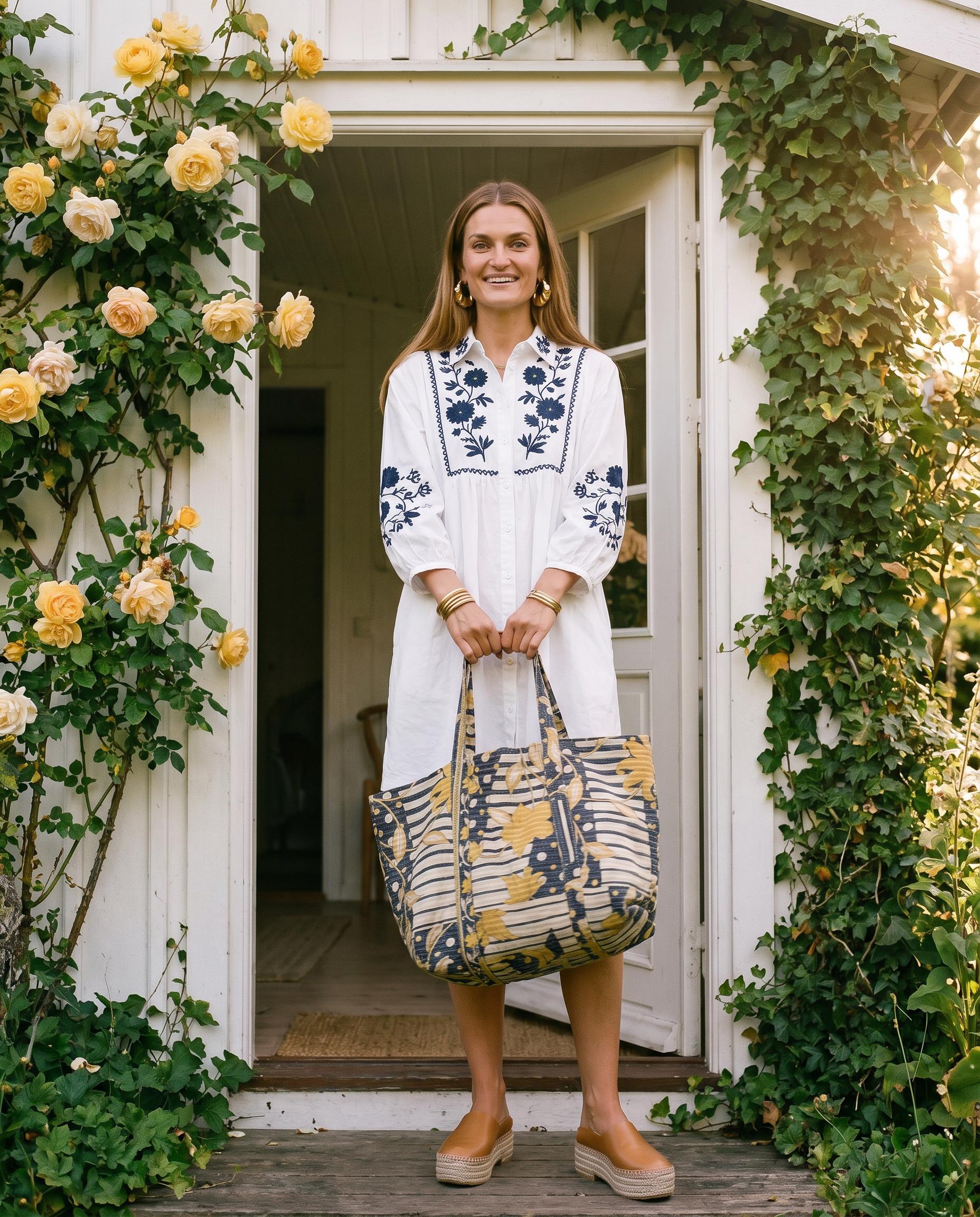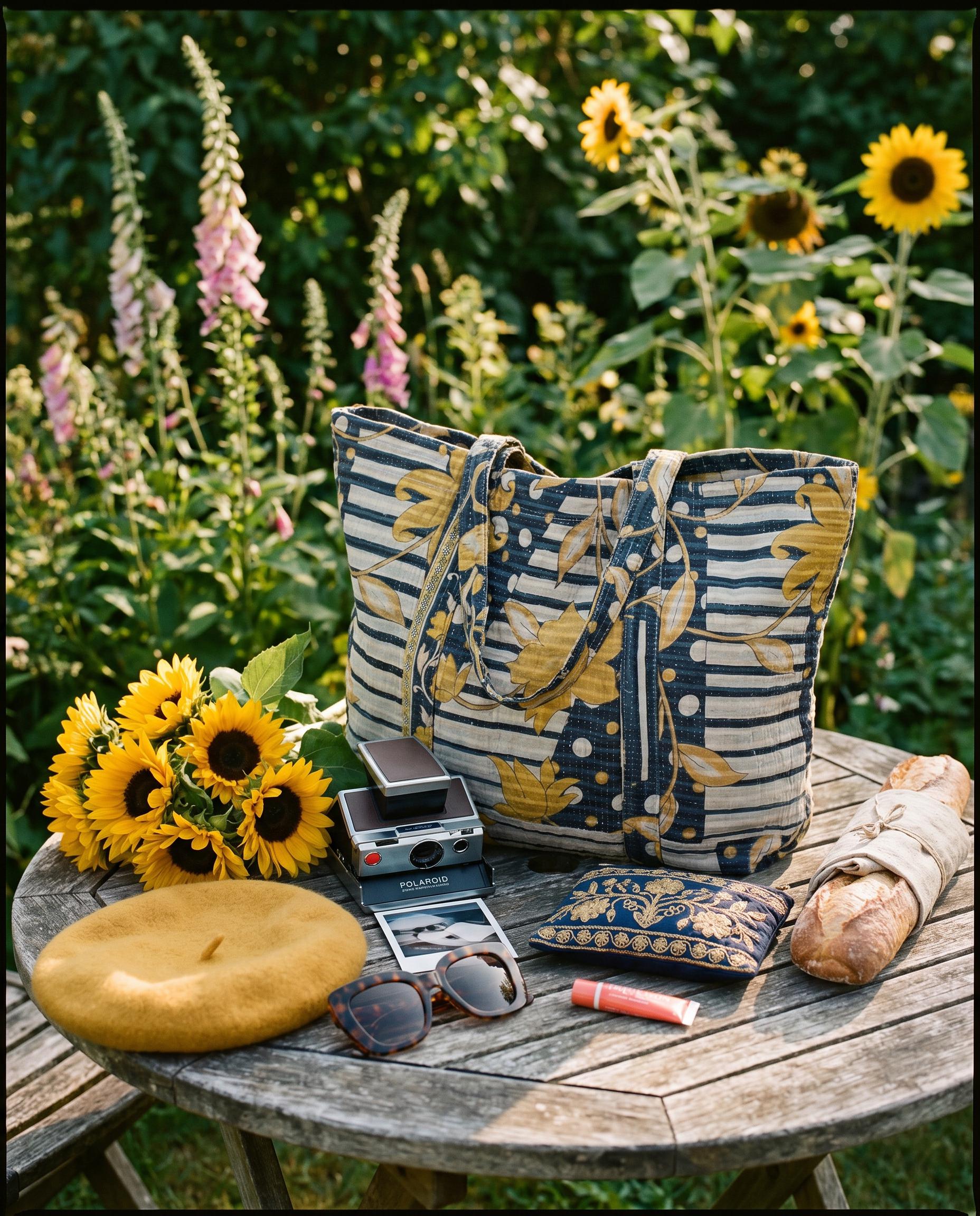 A one-of-a-kind quilted tote bag handcrafted in Jaipur using traditional Kantha stitching.